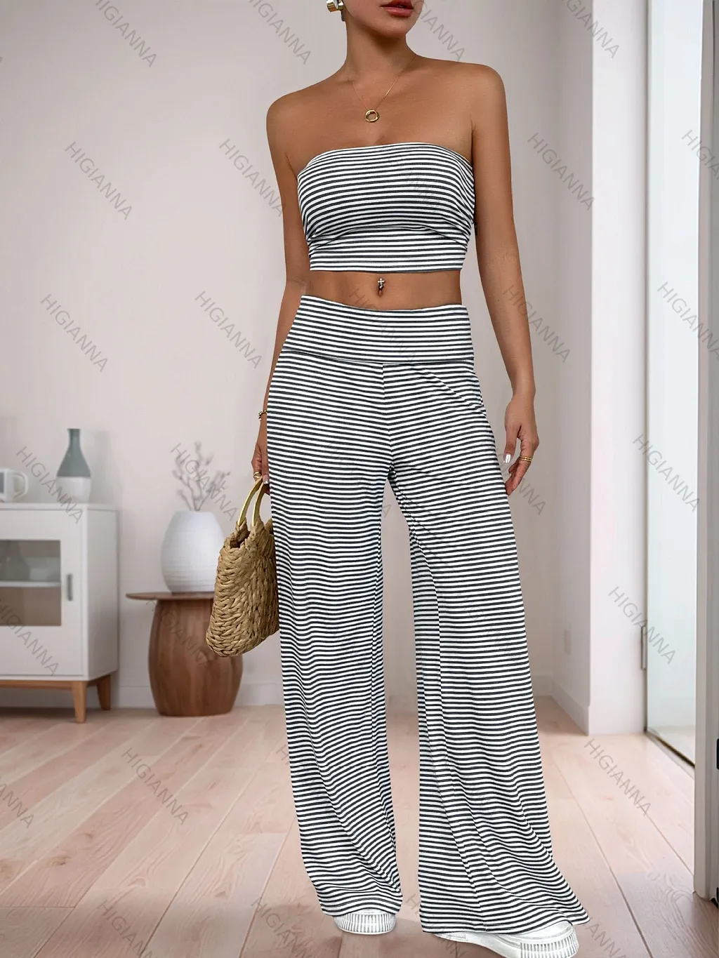 This two-piece set features a bandeau style crop top and matching wide leg pants with an allover striped pattern. Designed for comfort and style, the soft, stretchy fabric makes it perfect for casual outings, lounging, or vacation wear. The elasticized top offers a secure fit, while the relaxed pants provide ease of movement and a laid-back look.